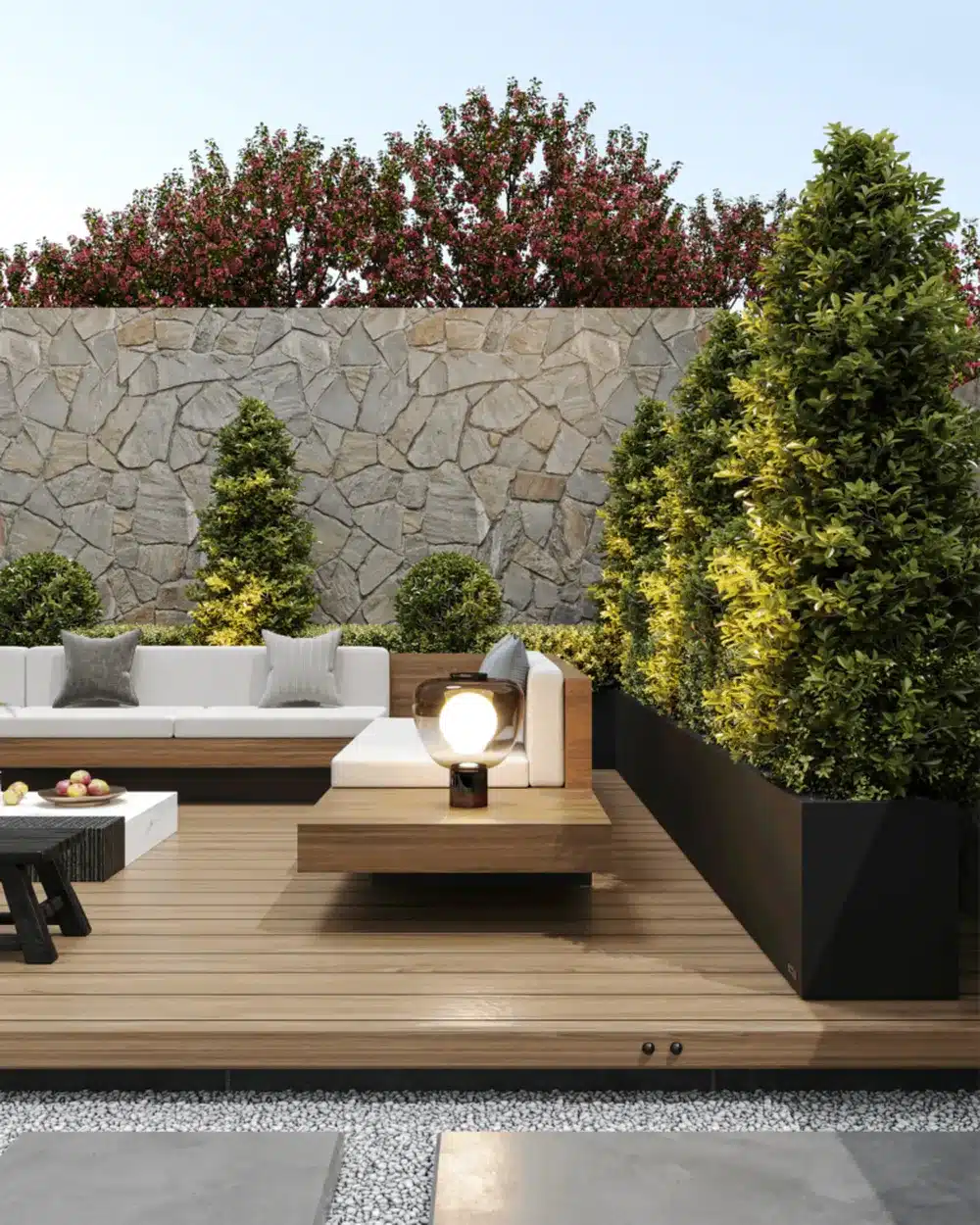 Einer der Hauptvorteile dieses Systems ist die Schaffung von Ebenen in der Außengestaltung. Durch die Kombination von Kästen unterschiedlicher Höhe entsteht eine dynamische Komposition, die viel ansprechender wirkt als eine Reihe von Töpfen, die direkt auf dem Boden stehen. Der Kontrast zwischen dem satten Grün der Blätter und der schwarzen Metalloberfläche fügt sich ideal in den industriellen oder skandinavischen Stil ein.